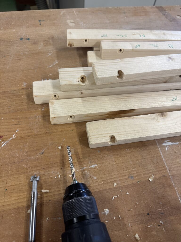 Für die Montage des Dachhimmels haben wir zusätzlich Unterkonstruktionshölzer zugesägt. Diese wurden auf den passenden Winkel angeschrägt, damit sie flach am Dach und den Holmen anliegen.