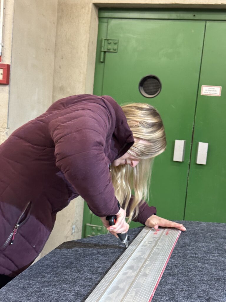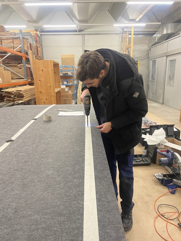 Die Filzplatte liess sich problemlos mit einem normalen Cuttermesser zuschneiden. Die Ausschnitte für die Deckenspots haben wir mit einem Kreisschneider gemacht. Die Schraubenlöcher für die späteren Schränke haben wir vor der Montage exakt vermessen und konnten sie nach dem Einbau punktgenau durch die Filzplatte bohren.