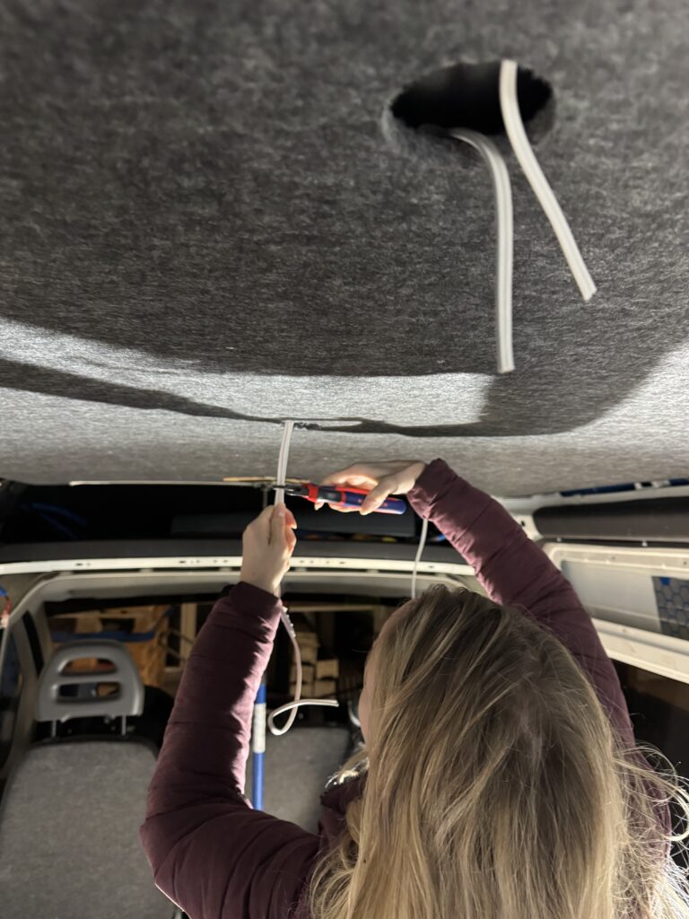 Alle elektrischen Leitungen haben wir sicherheitshalber in einem Textilschlauch verlegt, um Beschädigungen zu vermeiden – auch wenn die Kabel nur zwischen Isolation und Filz liegen. Den Deckenspot bei der Türe haben wir separat verkabelt, damit man ihn später eventuell einzeln ansteuern kann (zum Beispiel beim Öffnen der Türe).
