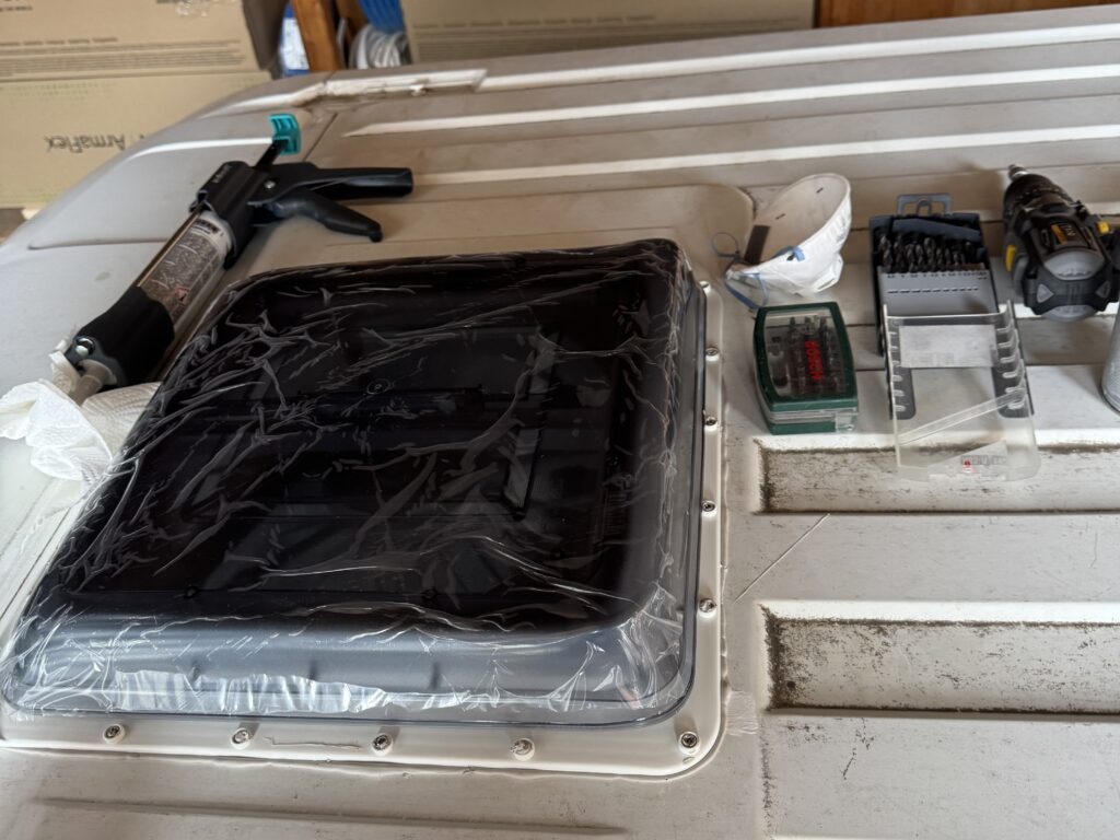 Der Lüfter wurde auf das Dach gesetzt, verschraubt – und zum Schluss haben wir alle Schraubenköpfe mit Sikaflex 521UV verklebt und zusätzlich abgedichtet. So kann wirklich kein Wasser eindringen, auch nicht bei Starkregen oder Dauerbelastung.