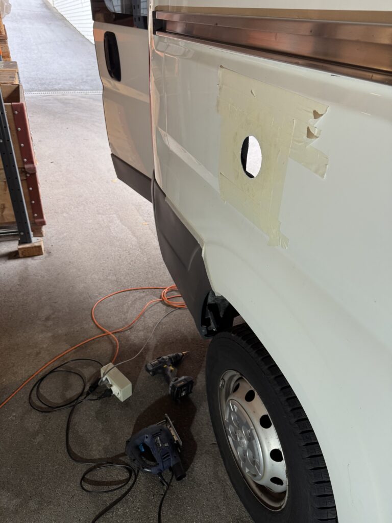 In der Fahrzeugwand haben wir dann den Ausschnitt für den Befüllstutzen gesägt, mit welchem der Tank von aussen befüllt werden kann.