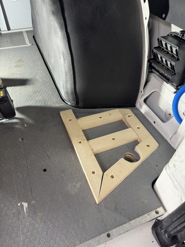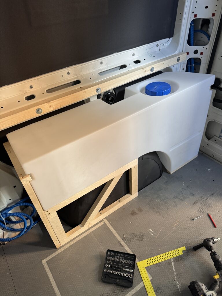 Das Ausmessen und das Platzieren des Wassertanks ist nicht ganz einfach, da der Wassertank an der Unterseite ein Ablassventil mit einem ca. 7cm langen Stutzen besitzt. Sobald wir den Tank vermessen haben und sicher waren, wo das Loch in den Boden gebohrt werden muss, konnten wir den Tank dann das erste Mal in das Fahrzeug setzten.