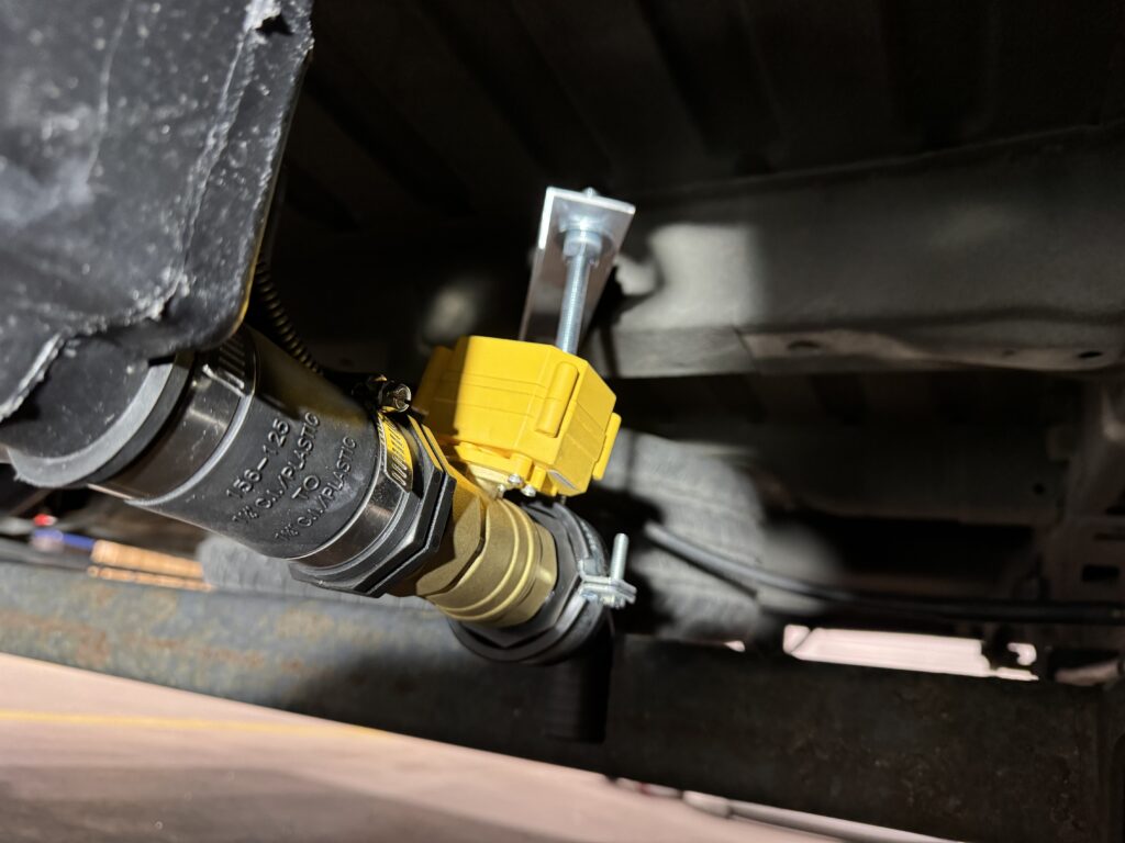 Um das Grauwasser zu entleeren setzen wir ein elektrisches Kugelhahnventil von Lilie ein. Dieses passt mit dem entsprechenden Gummi-Adapter direkt auf einen der beiden 40mm-Tankausläufe.