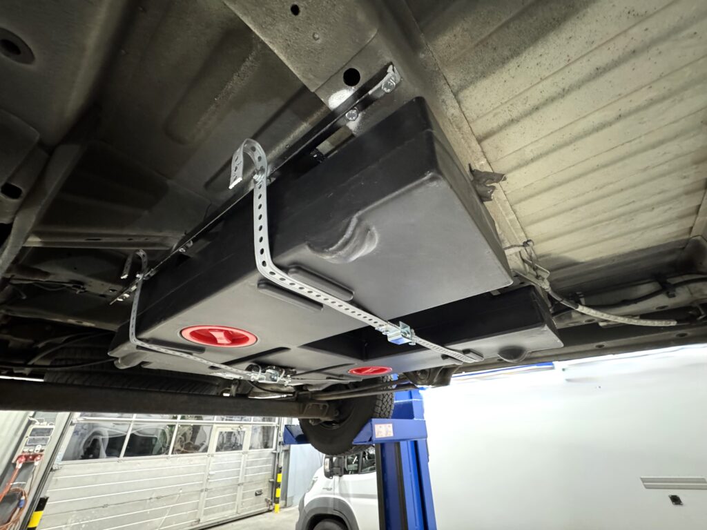 Dank dem Zugang zu einer gut ausgestatteten Werkstatt mit Fahrzeuglift, konnten die Montageträger und der Wassertank bequem montiert werden. Das Arbeiten am Unterboden ist so um einiges einfacher und erlaubt ein genaueres Arbeiten.