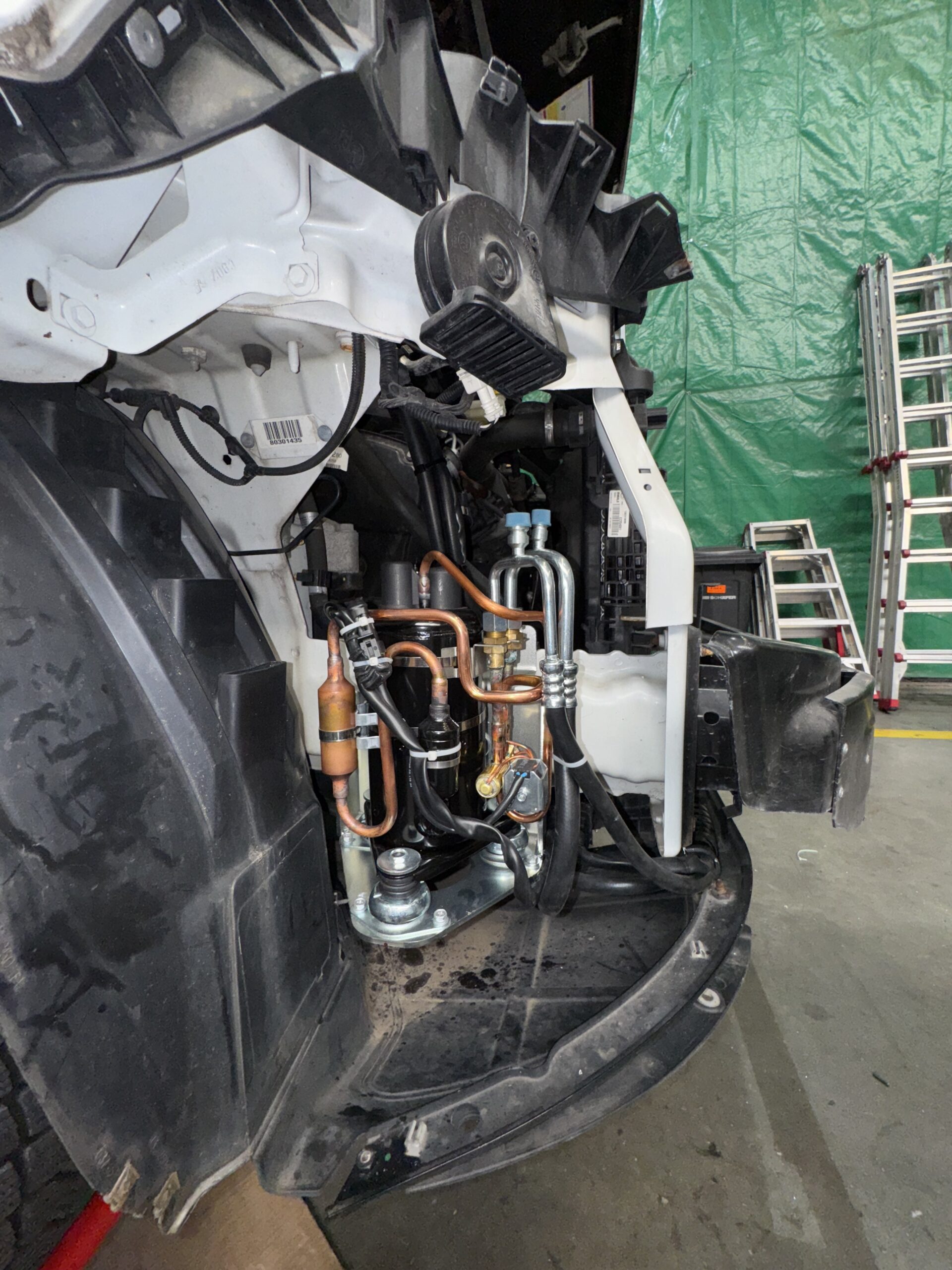 Die Kälteeinheit wurde in Fahrtrichtung links, der Kompressor in Fahrtrichtung rechts vor den Vorderrädern montiert. Glücklicherweise verfügen die neueren Sevel-Fahrzeuge bereits über eine vorhandene Durchführung, durch die sowohl die Kältemittelleitungen als auch die elektrischen Verbindungskabel sauber in den Innenraum geführt werden können.