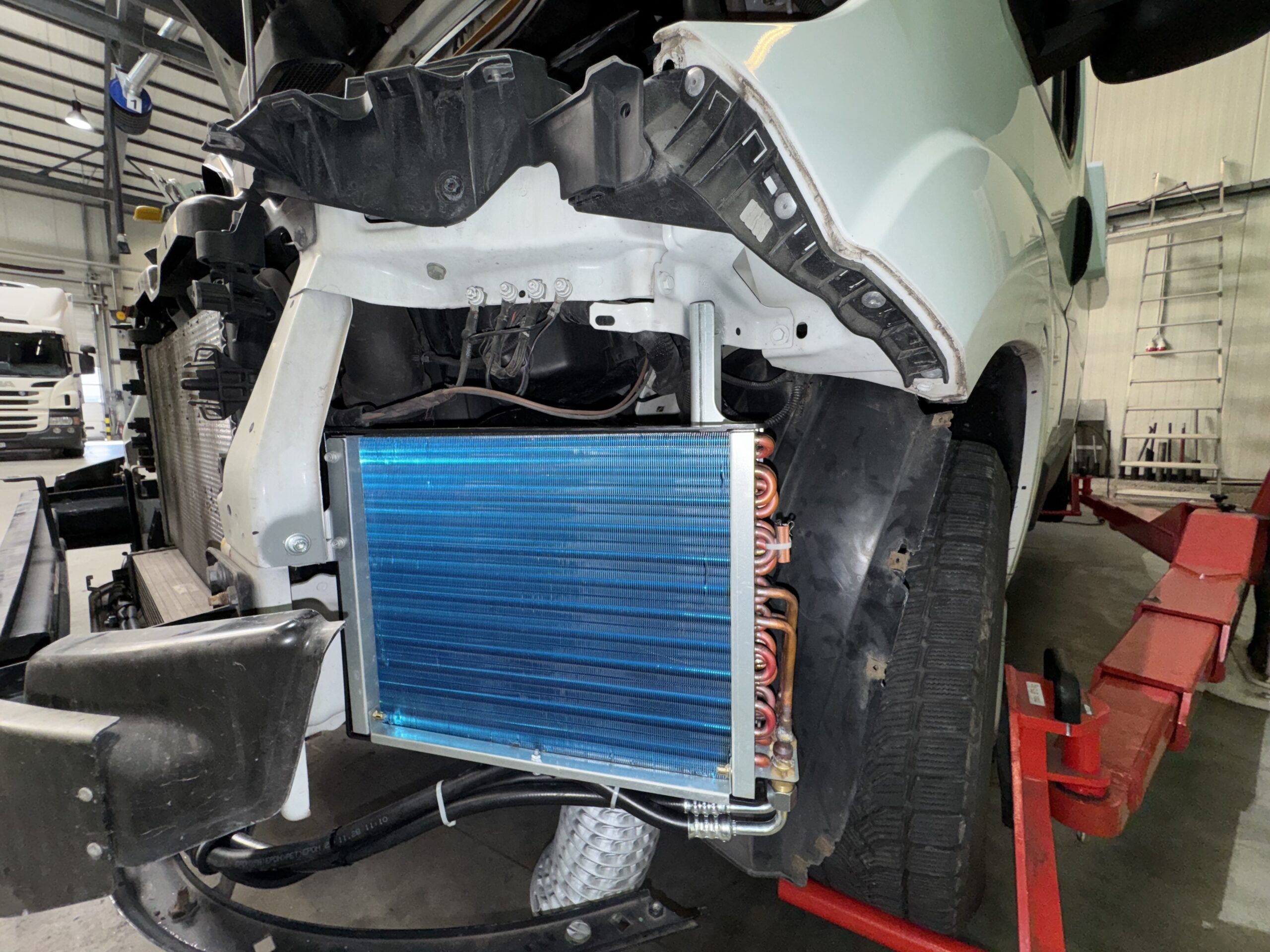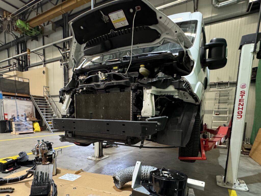 Für die Montage haben wir das Fahrzeug zunächst auf einer Hebebühne angehoben, um besseren Zugang zur Fahrzeugfront zu erhalten. Anschliessend wurden Abdeckungen und Verschalungen der Front entfernt, um Platz für die beiden Haupteinheiten zu schaffen.