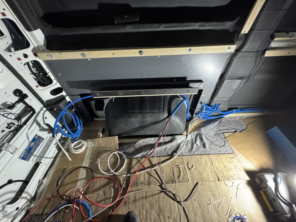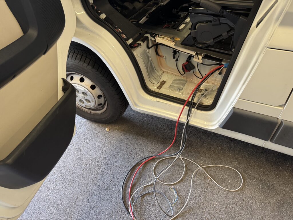Nach der Vorbereitung der Kabelrohre konnten die Leitungen eingezogen werden. Für die 12V-Verkabelung kamen hauptsächlich FLRY-B Litzen zum Einsatz, meist mit einem Querschnitt von 2.5 mm². Diese Kabel sind flexibel, vibrationsfest und ideal für den Fahrzeugeinsatz.