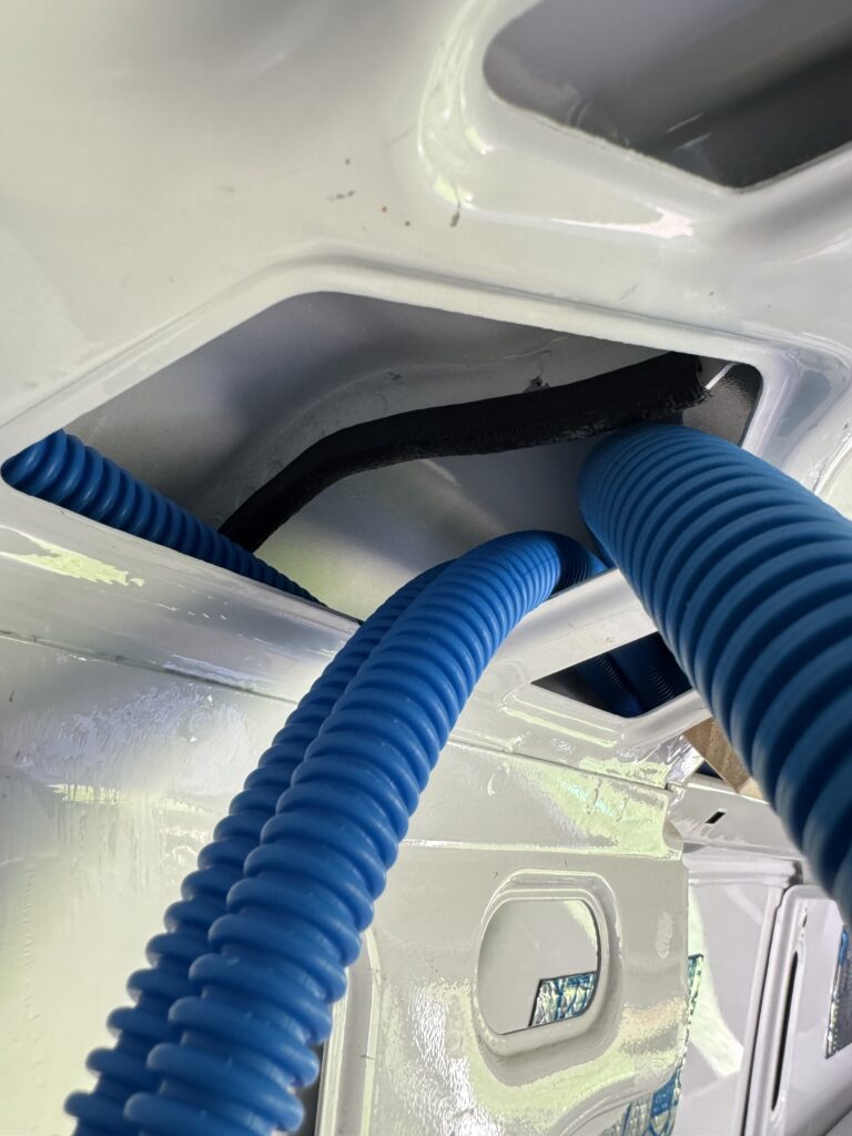 Die Rohre wurden sowohl im Boden unter der Bodenplatte, als auch in den Holmen des Fahrzeugs verlegt. Scharfkantige Ecken und Bleche haben wir zusätzlich mit Kantenschutz versehen, um Schäden an Rohr und Kabel zu vermeiden.