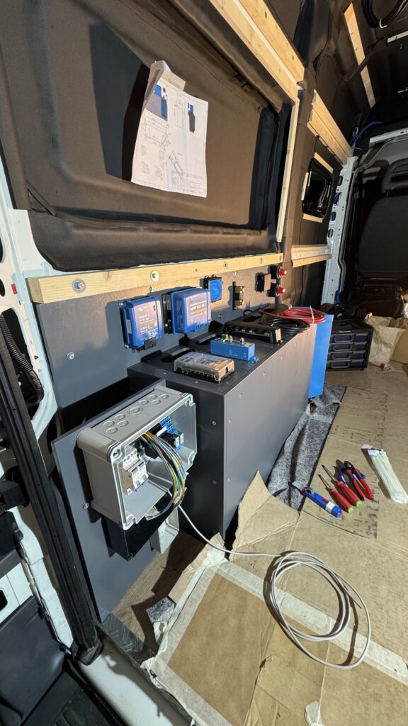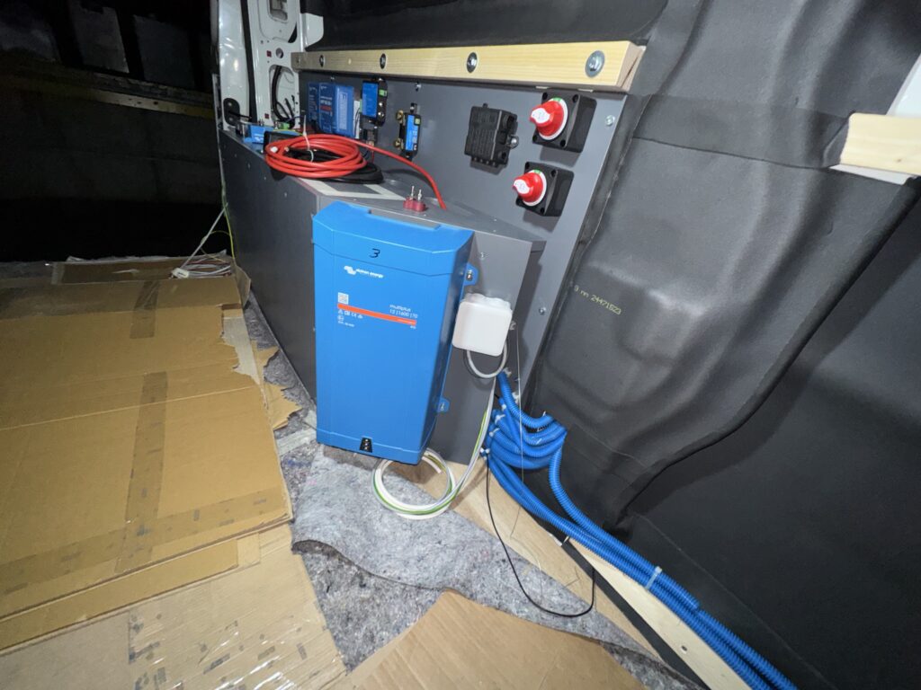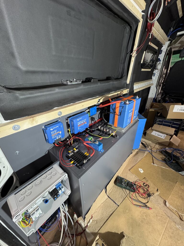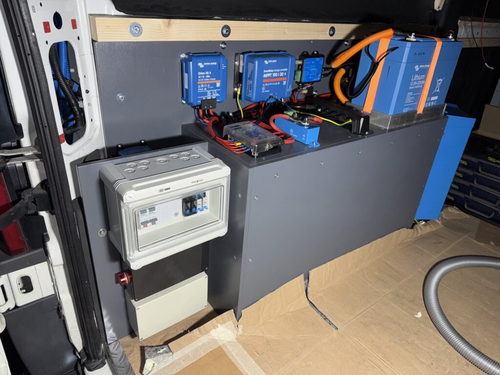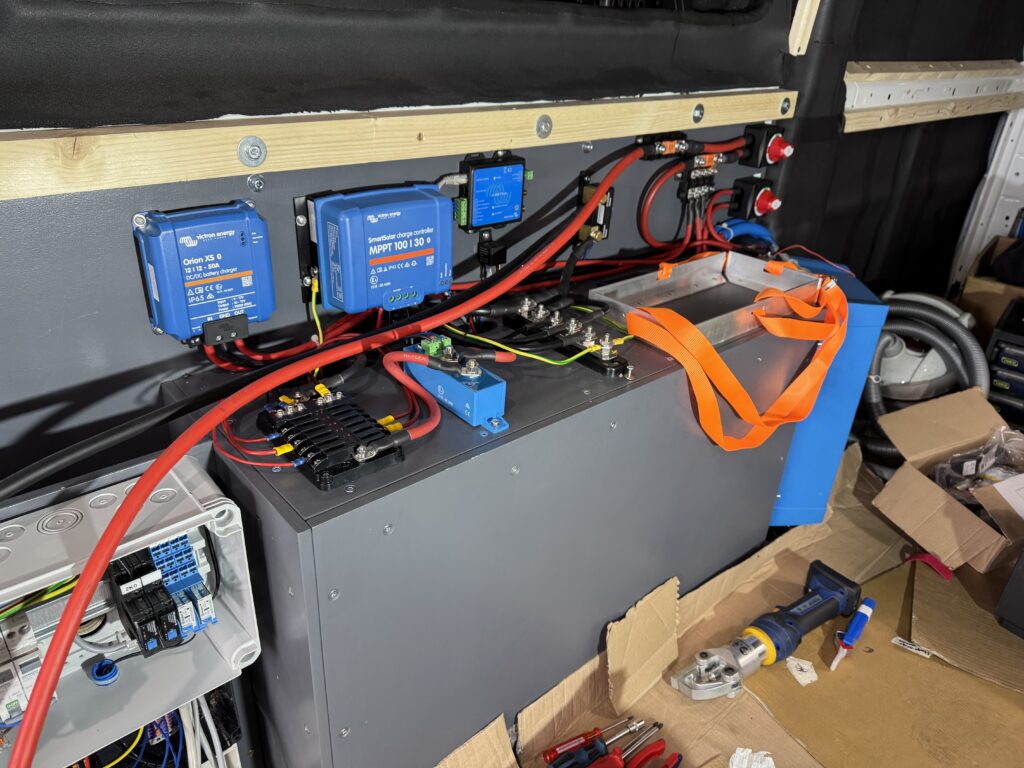 Zum Abschluss wurde die Batterie über Landstrom vollständig aufgeladen und die Kommunikation mit dem Cerbo GX getestet. Somit ist das elektrische System nun einsatzbereit und die verschiedenen Verbraucher im Van können nun nach und nach an die Verteilung angeschlossen werden.